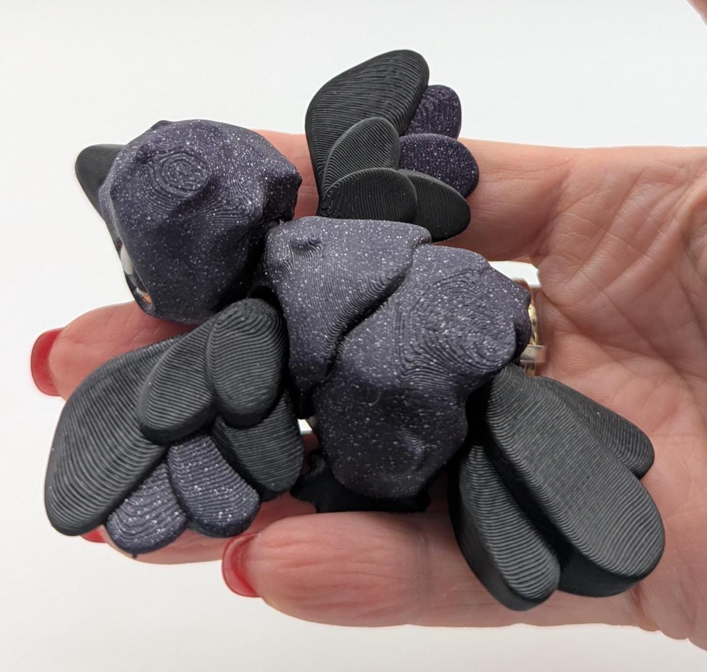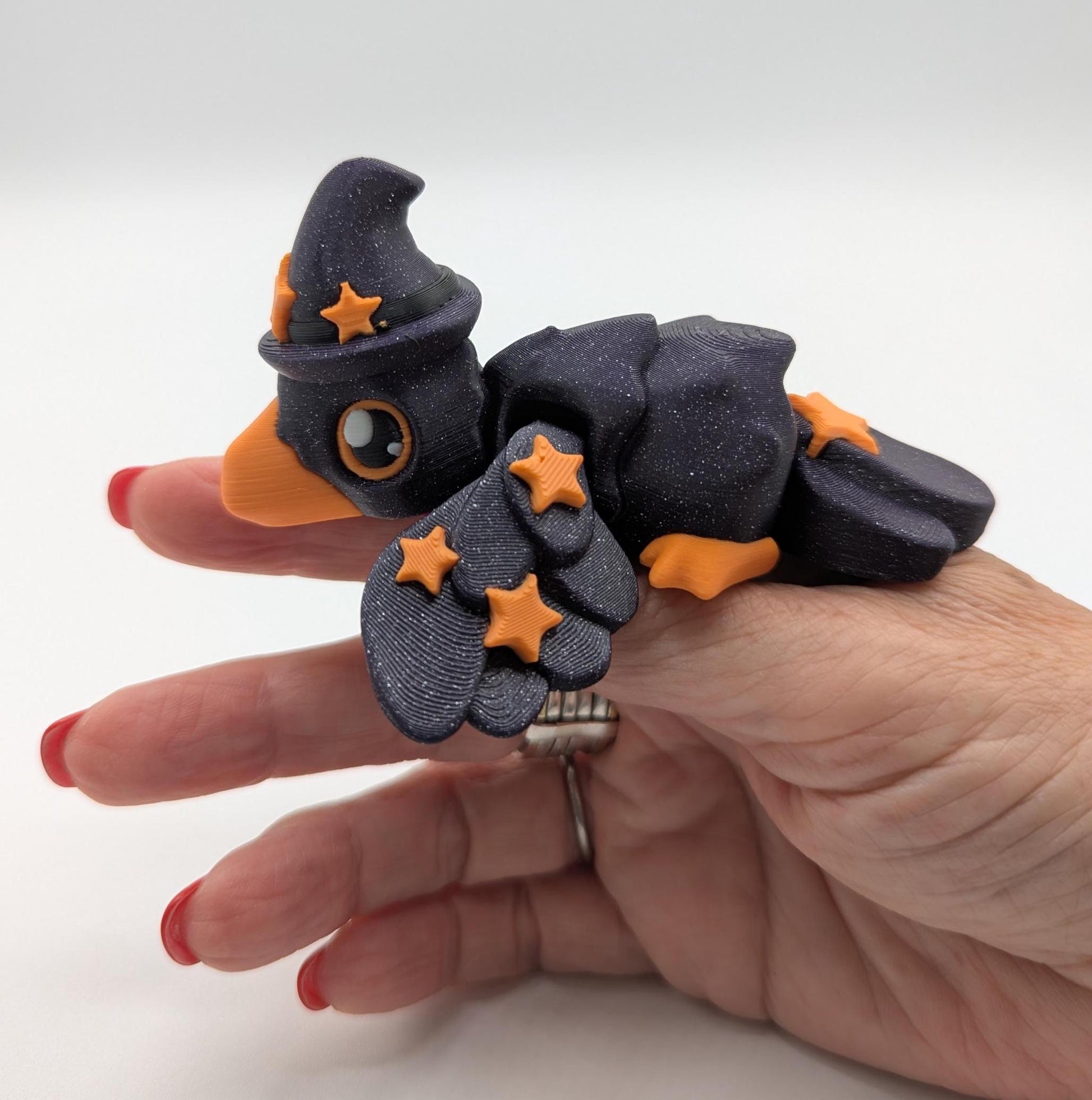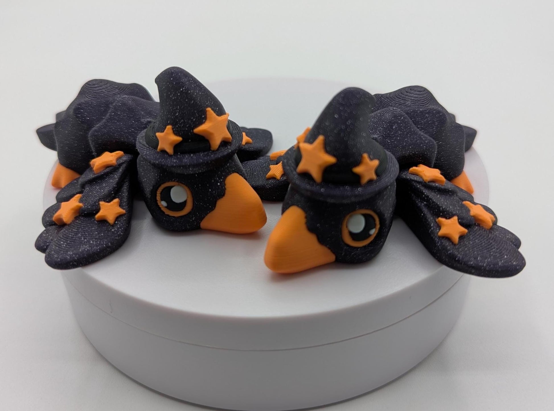 Crafted from eco-friendly PLA, these lightweight yet durable fidget toys are available as a crow or a wizard crow. Printed in classic Halloween colors of Purple Sparkle and Orange. Whether perched on a desk, gifted to a bird lover, or used as a fun fidget toy, the Flexi Crow and Wizard Crow make for delightful and creative companions!